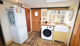Exposed brick tiled floor, window to stable door to rear. Butler sink with cupboards under plumbing for washing machine, cupboard housing the water tank, built in pantry. Downlighters, radiator.