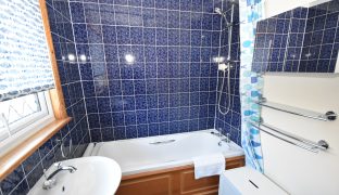 Low level w/c, wash basin, panelled bath with built in shower. Partially tiled walls, radiator, extractor fan, shaver point, panelled door, window to front aspect.