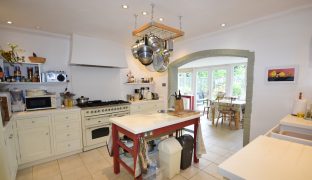 Appealing in-frame kitchen cupboards and drawers with ceramic double sink, island unit with inset sink. Large range style cooker with extractor hood and built in dishwasher. Fitted shelving, tiled floor, coved ceiling and down lighters. Open to: